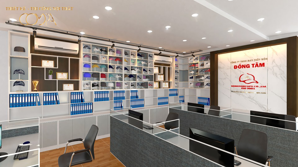 Thiết kế nội thất văn phòng Nón Đồng Tâm hiện đại, đa năng với đồ nội thất được làm bằng ván gỗ công nghiệp là chính. Nhìn vào tổng quan văn phòng chắc hẳn các bạn cũng thấy đây là văn phòng của công ty chuyên sản xuất và cung cấp nón thời trang. Mẫu thiết kế văn phòng 2 trong 1, vừa là văn phòng làm việc, vừa là khu trưng bày sản phẩm, đây đúng là một mũi tên trúng 2 đích.
