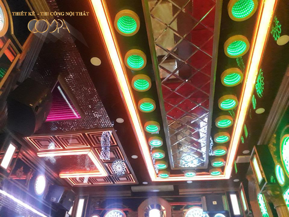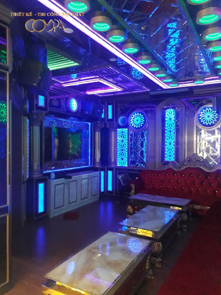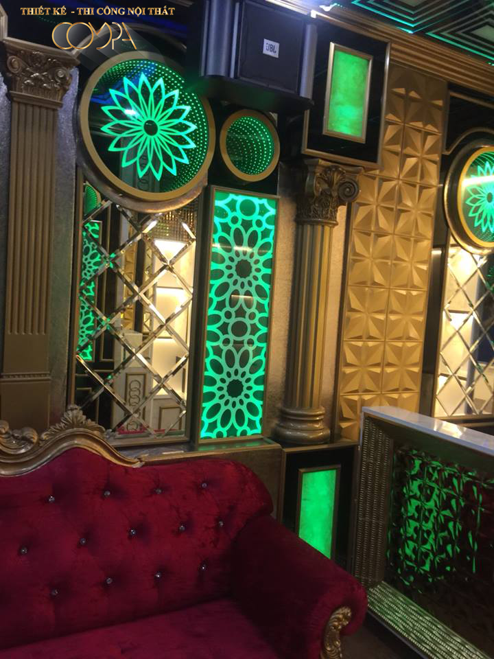 Hệ thống cách âm, tiêu âm sử dụng vật liệu chất lượng cao đảm bảo 100% cách âm kèm theo đó là những đồ nội thất như bàn ghế đồ trang trí được thiết kế tinh xảo với đường cong đặc trưng của kiến trúc tân cổ điển, hệ thống âm thanh chân thực sống động, ánh sáng bố trí cảm ứng theo nhạc với nhiều loại đèn led màu sắc rực rỡ làm tôn thêm không gian sang trọng của toàn phòng hát.
